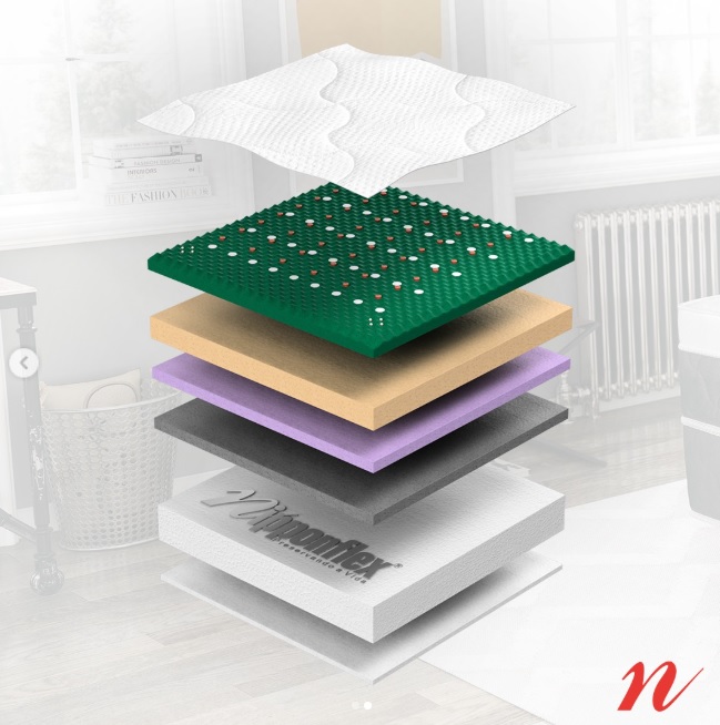 El Rabatan® que compone la superficie superior de los dispositivos Nipponflex es un perfil de poliuretano de alta tecnología, tratado con compuestos especiales y vulcanizado a una temperatura de aproximadamente 180 ° C. Tiene miles de puntos de acupresión reforzados que imitan las yemas de los dedos de un masajista, proporcionando un relajante auto-masaje. Los extremos rígidos del Rabatan® soportan el peso del cuerpo, evitando la obstrucción de la circulación sanguínea. Por su alto relieve y vulcanización, el paso del aire por los poros del Rabatan® elimina el exceso de sudoración nocturna, manteniéndolo seco y fresco. Rabatan® utiliza FIR Bioceramic®, FIR NG®, inserciones magnéticas y, en algunos dispositivos, un vibrador interno.